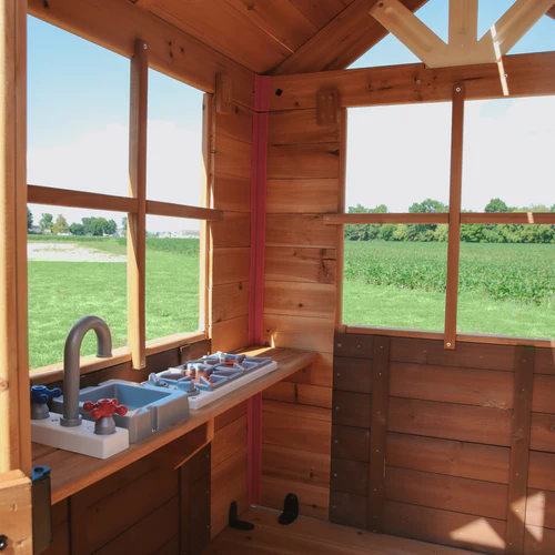 • Attached Playhouse: Elevated playhouse brings imaginations to life with saloon-style doors, a wrap-around balcony, and a play kitchen featuring a toy stovetop and sink