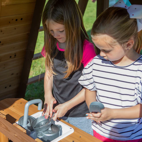 - Lower Playhouse: Includes a play kitchen with a toy sink, battery powered accessories, cookware set, dinner bell, and full front door to inspire creativity